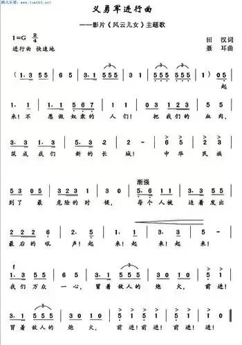 《义勇军进行曲》是由田汉作词,聂耳作曲的歌曲,是电影《风云儿女》的主题歌,被称为中华民族解放的号角,自1935年在民族危亡的关头诞生以来,对激励中国人民的爱国主义精神起了巨大的作用,后成为中华人民共和国国歌。中华人民共和国国歌是中华人民共和国的象征和标志。一切公民和组织都应当尊重国歌,维护国歌的尊严。