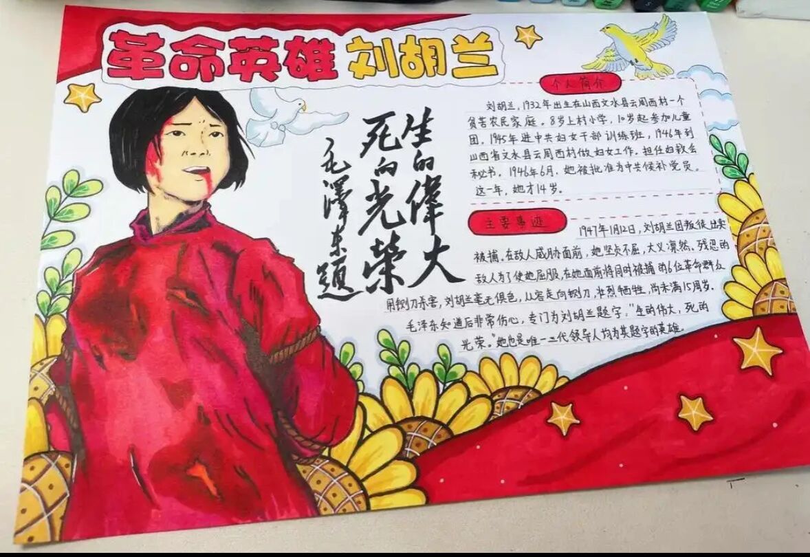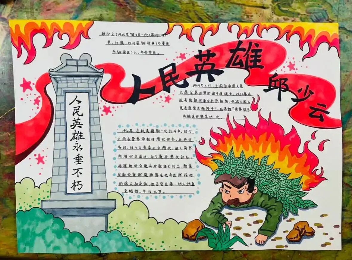 活动前期,各班级通过班会课组织学生搜集革命先烈与时代楷模事迹,整理资料、筛选图片积累素材。创作阶段,同学们围绕“英雄精神”设计版面,用水彩勾勒场景、以思维导图梳理品格,并融入手写感悟。展评阶段,师生评审团从主题、设计、内容三方面打分,优秀作品旁设留言区供交流,形成互动氛围。