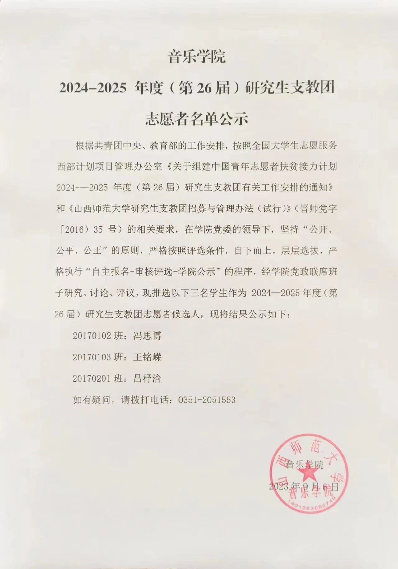 pg娱乐电子游戏官网入口2024-2025 年度(第26届)研究生支教团志愿者名单公示
