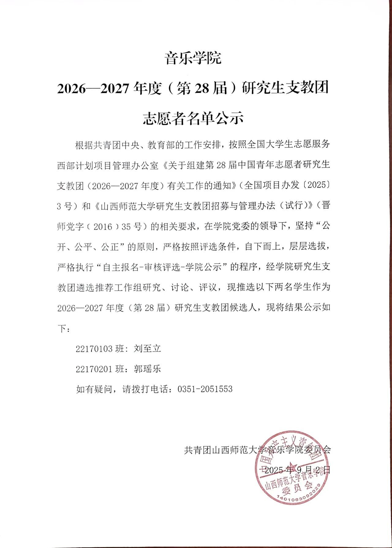 pg娱乐电子游戏官网入口2026-2027年度(第28届)研究生支教团志愿者名单公示